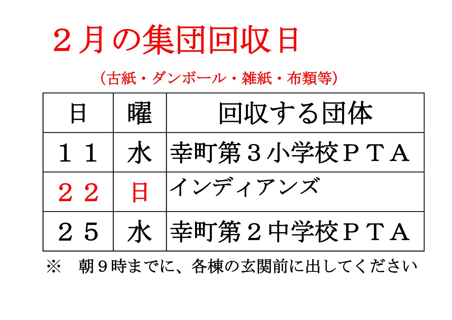 2 月の古紙類集団回収および不燃ごみ回収について以下の通りご案内いたします。