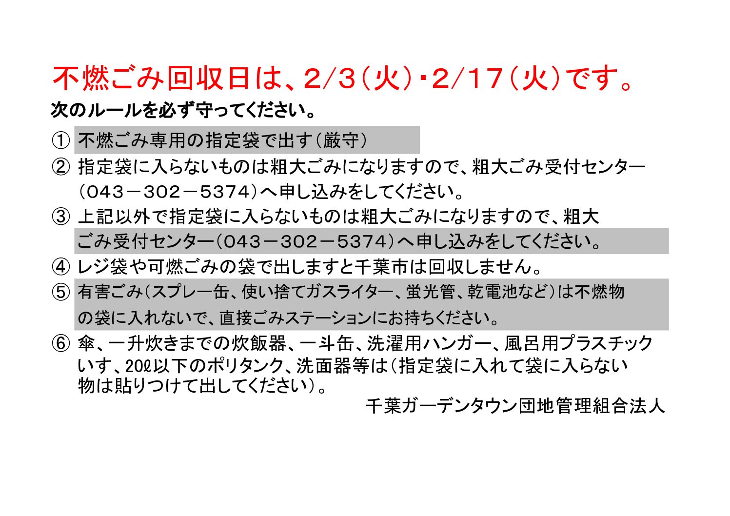 ※千葉ガーデンタウンのごみ収集は管理組合によって管理・運営されています。ガーデンタウン以外からのゴミや古紙類のお持ち込み・お持ち出しは運営上の支障となりますのでご遠慮願います。